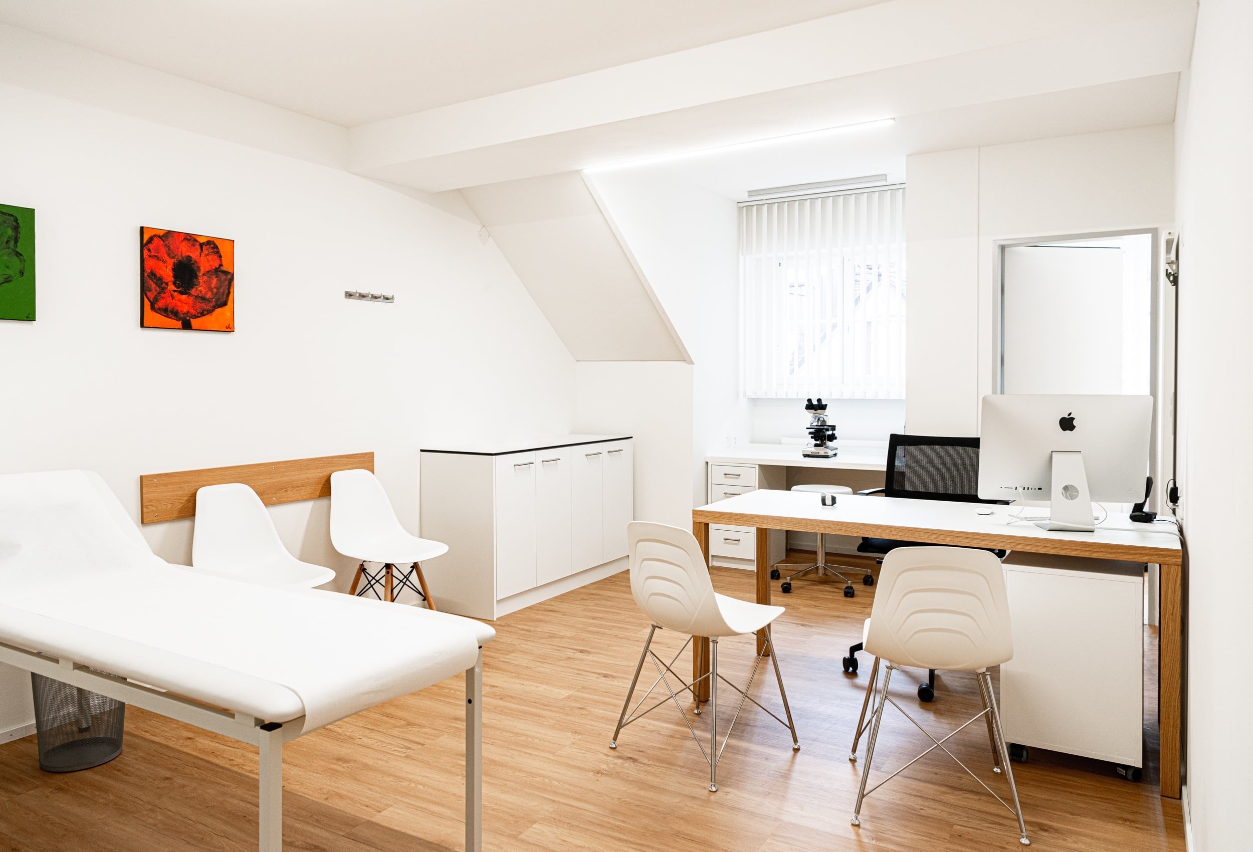Seit über 30 Jahren befindet sich diese im Dachgeschoss des denkmalgeschützten „Haus zum Schwert“ im Zentrum der historischen Altstadt von Altstätten. Gegründet wurde die Praxis von Dr. Rolf Ingold-Oertle, welcher sie im Januar 2020 an Dr. Michael Holzer übergeben hat. Die ehemals erste dermatologische Praxis im Rheintal wurde Anfang 2020 grundlegend renoviert. Seitdem treffen klare Linien, helle Farben und viel Holz auf alten Charme mit Blick über die Dächer von Altstätten. Die Kombination verleiht den Räumlichkeiten eine ganz besondere Atmosphäre in der sich Patientinnen und Patienten wie auch das Team wohlfühlen.